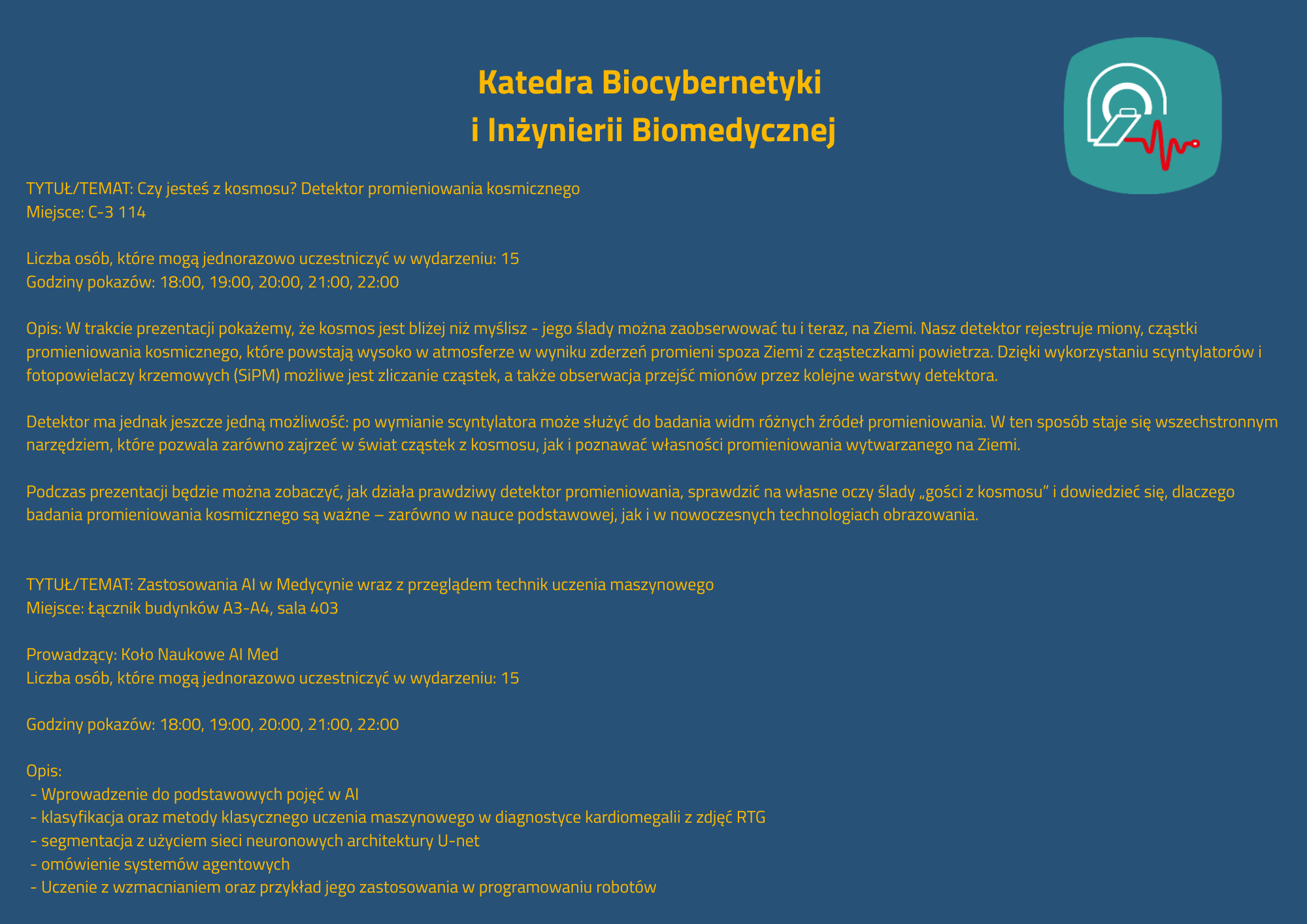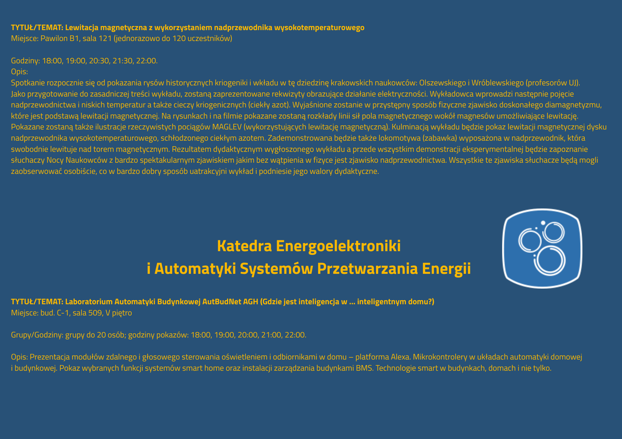 Data publikacji: 19 września, 2025Kategoria: Wydarzenia wydziałowe Małopolska Noc Naukowców 2025 na WEAIiiB Informacje dla studentów i doktorantów Wszystkie aktualności Wydarzenia wydziałowe Osiągnięcia Stypendia i wyjazdy Praktyki, staże, oferty pracy Konferencje, seminaria, wykłady Konkursy Plan wydarzeń organizowanych przez Wydział Elektrotechniki, Automatyki, Informatyki i Inżynierii Biomedycznej w trakcie Małopolskiej Nocy Naukowców 2025. Informacje dla studentów i doktorantów Wszystkie aktualności Wydarzenia wydziałowe Osiągnięcia Stypendia i wyjazdy Praktyki, staże, oferty pracy Konferencje, seminaria, wykłady Konkursy